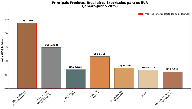 A imposição de tarifas de 50% sobre produtos brasileiros pelos Estados Unidos representa um choque operacional direto para o setor mineral nacional, especialmente para a Indústria de Transformação Mineral (ITM) e produtos siderúrgicos. Com exportações da ITM para os EUA totalizando US$ 2,89 bilhões apenas no terceiro trimestre de 2024, a medida tornará instantaneamente não competitivos os produtos brasileiros de maior valor agregado no mercado americano. O setor de ferro e aço semi acabado, que movimenta cerca de US$ 3 bilhões anuais para os Estados Unidos, enfrentará um custo adicional de aproximadamente US$ 1,5 bilhão, inviabilizando grande parte desse comércio.